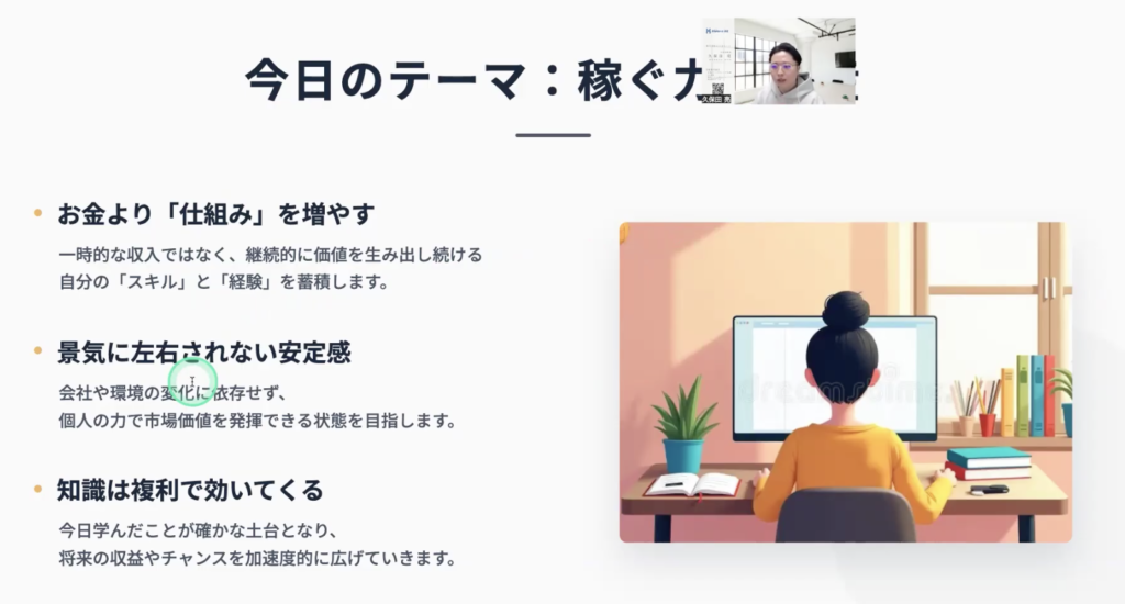 第二部では、キャリアの専門家が、AI時代における「稼ぐ力」の定義と、会社に依存しない個人の価値創造の重要性を提示。