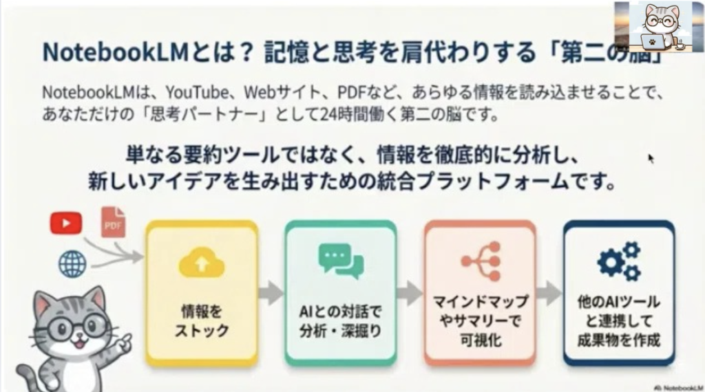セミナーは、NotebookLMを「記憶と思考を肩代わりする第二の脳」と定義し、その核となる機能と、実務での具体的な応用事例を中心に展開されました。