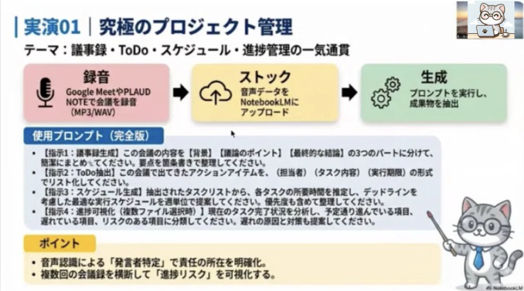 特に、従来のAIチャットツールが持つ情報のストック性や、大量のデータを扱う上での課題点を克服する、NotebookLMの圧倒的な情報処理能力について詳細に解説。その上で、資料作成やプロジェクト管理における「初動」を自動で高速化するテクニック、さらには自分専用の「専門家ノート」を構築し、AIをコンサルタントとして機能させる最先端の活用術が紹介されました。